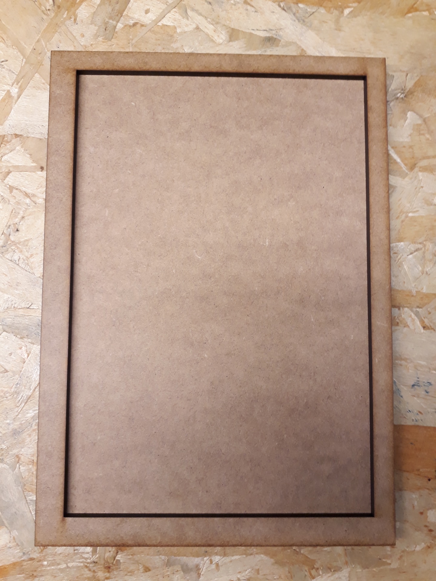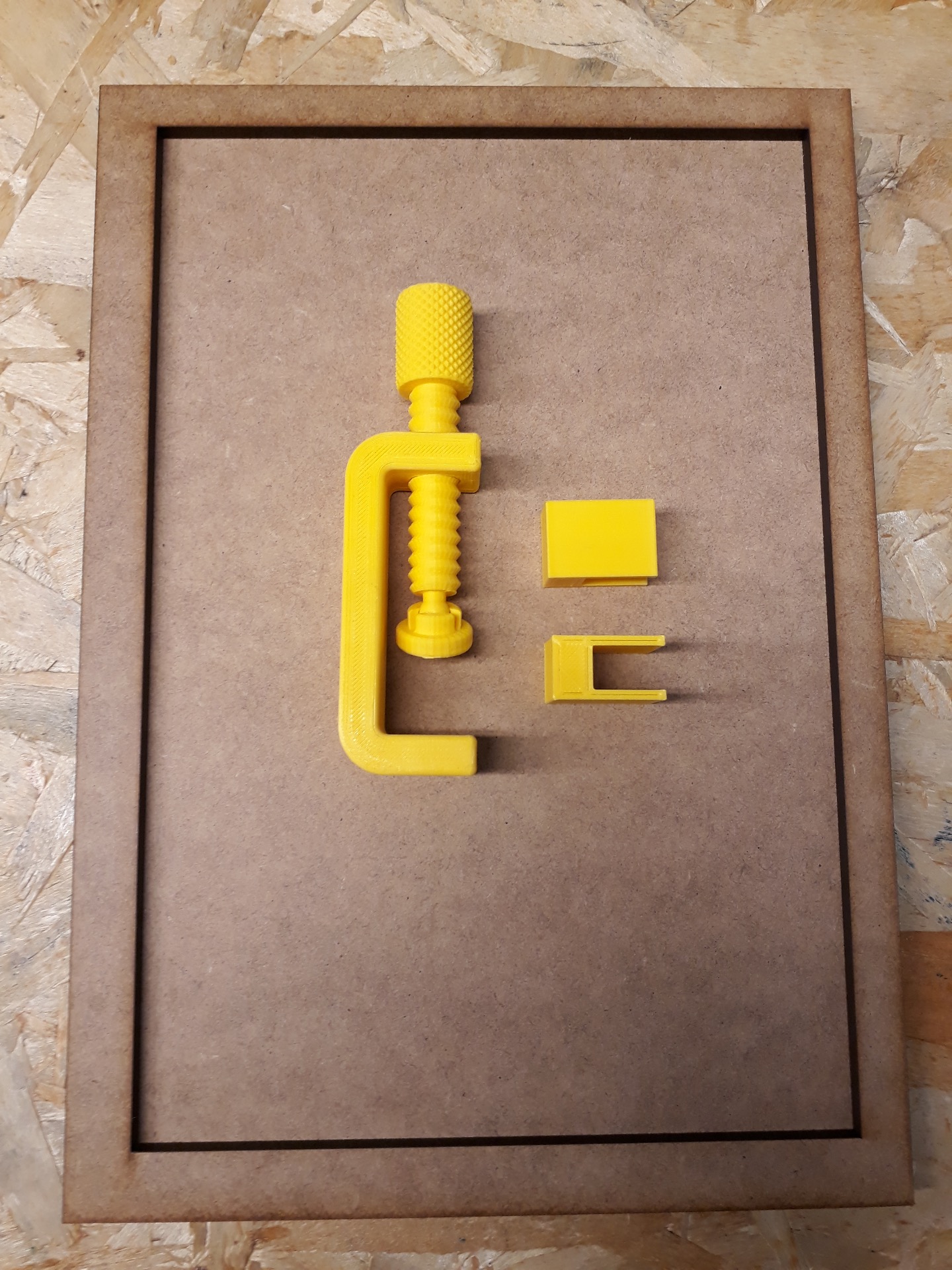 El resultado final sería un marco con una base de madera cortado a láser de tamaño DinA4 que se mantiene unido mediante 4 pinzas encajadas y se sujeta a la mesa con otra pinza regulable.